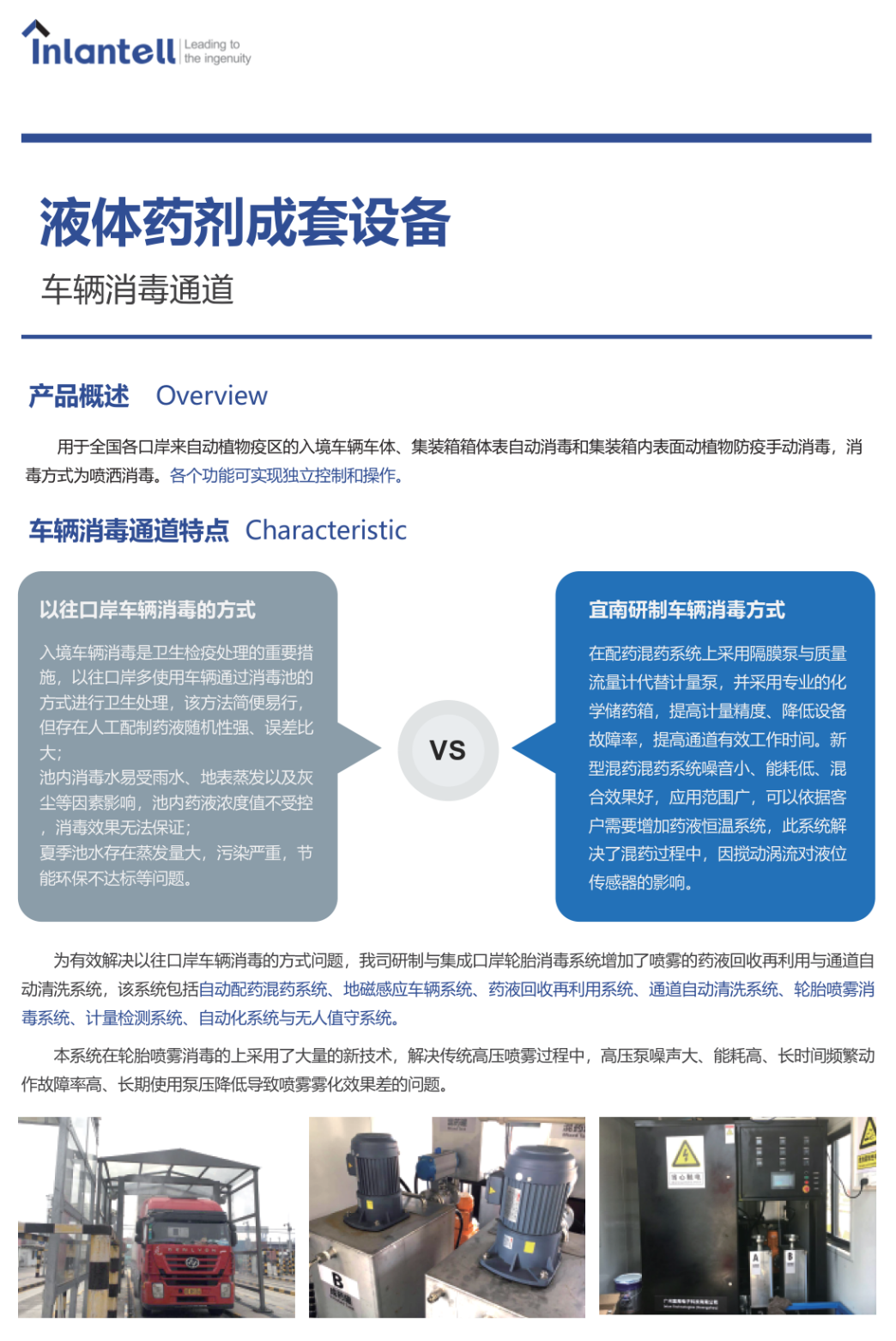 为有效解决以往口岸车辆消毒的方式问题,我司研制与集成口岸轮胎消毒系统增加了喷雾的药液回收再利用与通道自动清洗系统,该系统包括自动配药混药系统、地磁感应车辆系统、液回收再利用系统、通道自动清洗系统、轮胎喷雾消毒系统、计量检测系统、自动化系统与无人值守系统。 本系统在轮胎喷雾消毒的上采用了大量的新技术,解决传统高压喷雾过程中,高压泵噪声大、能耗高、长时间频繁动作故障率高、长期使用泵压降低导致喷雾雾化效果差的问题。